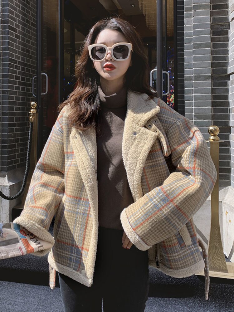 Women's Lambs Wool Short Coats Autumn Winter Wild New Korean Version Loose Plaid Notched Long Sleeve Casual Jacket